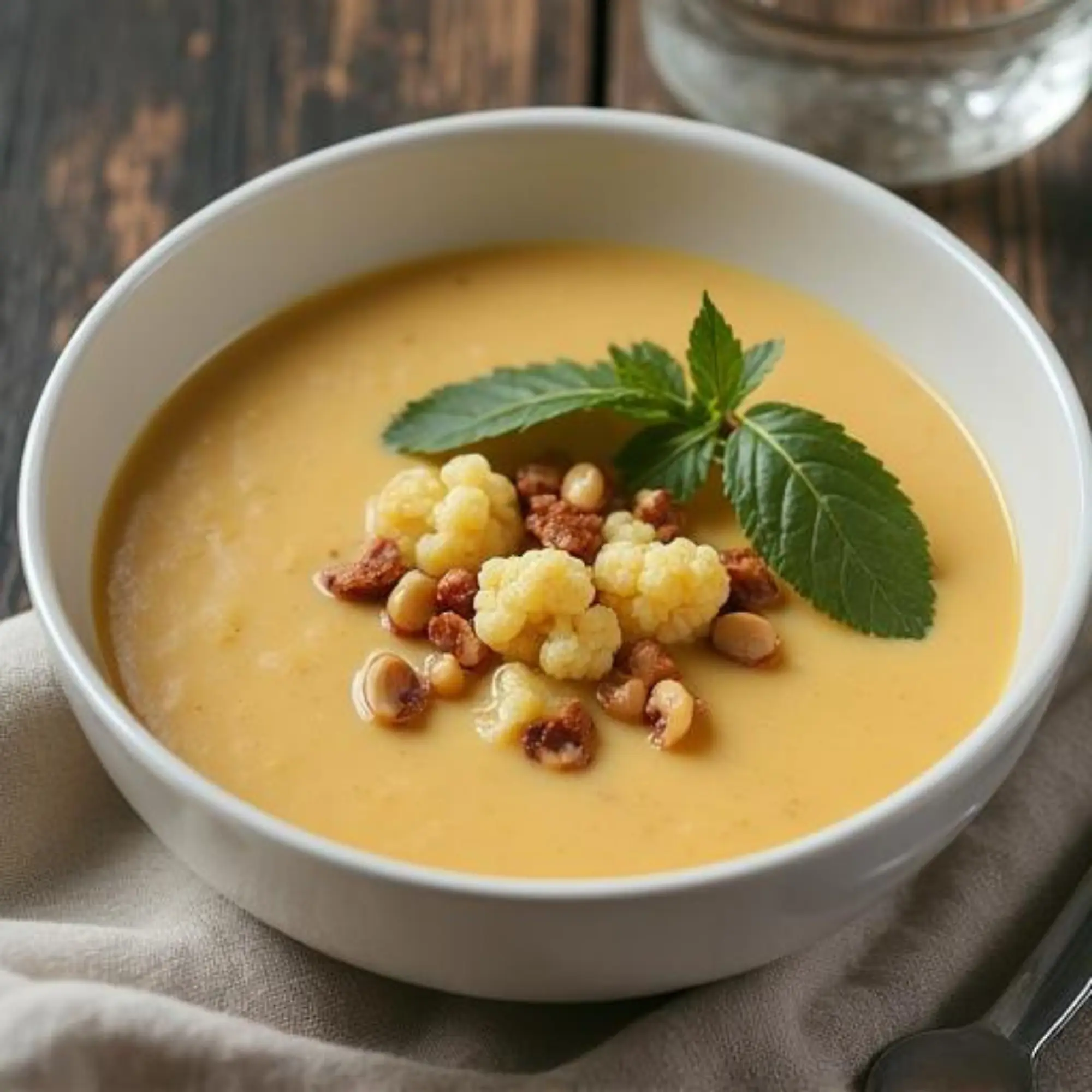 Blumenkohlsuppe mit Kokosmilch, mildem Curry & gerösteten Cashewnüssen