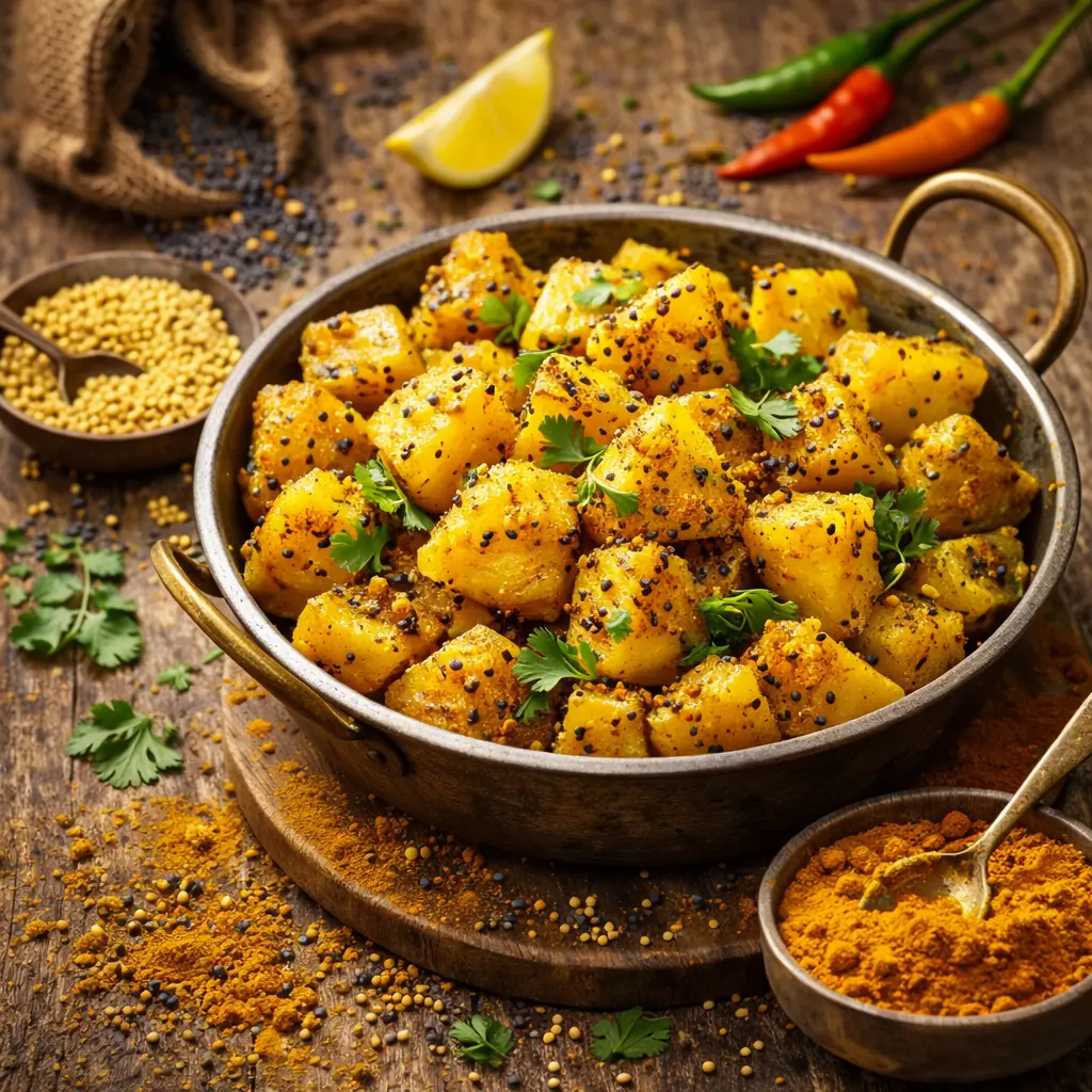 Goldene Kartoffeln mit indischen Gewürzen, knusprig und aromatisch.