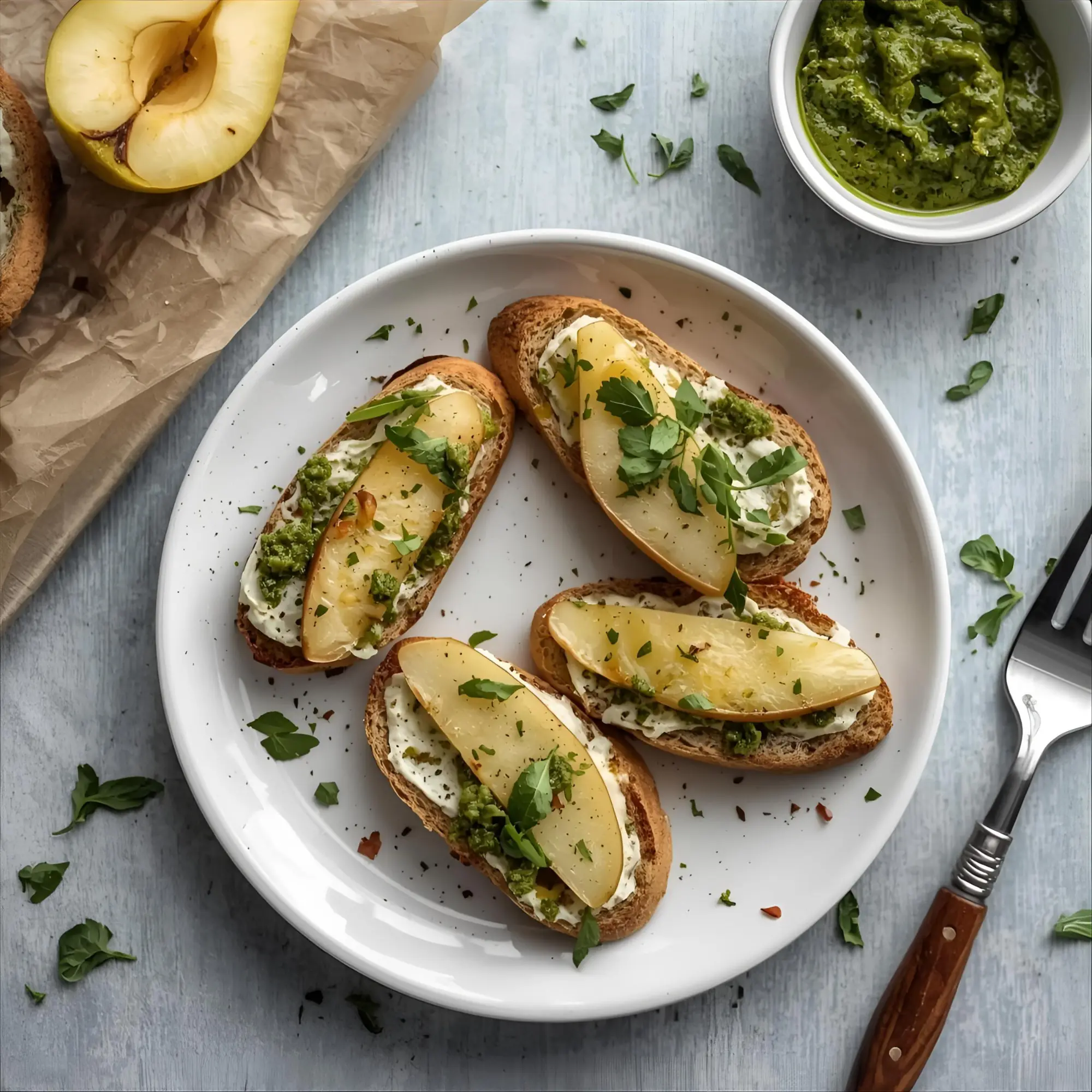Knusprige Toasts, hausgemachtes Pesto und saftige Birnen für einen mediterranen Aperitif.