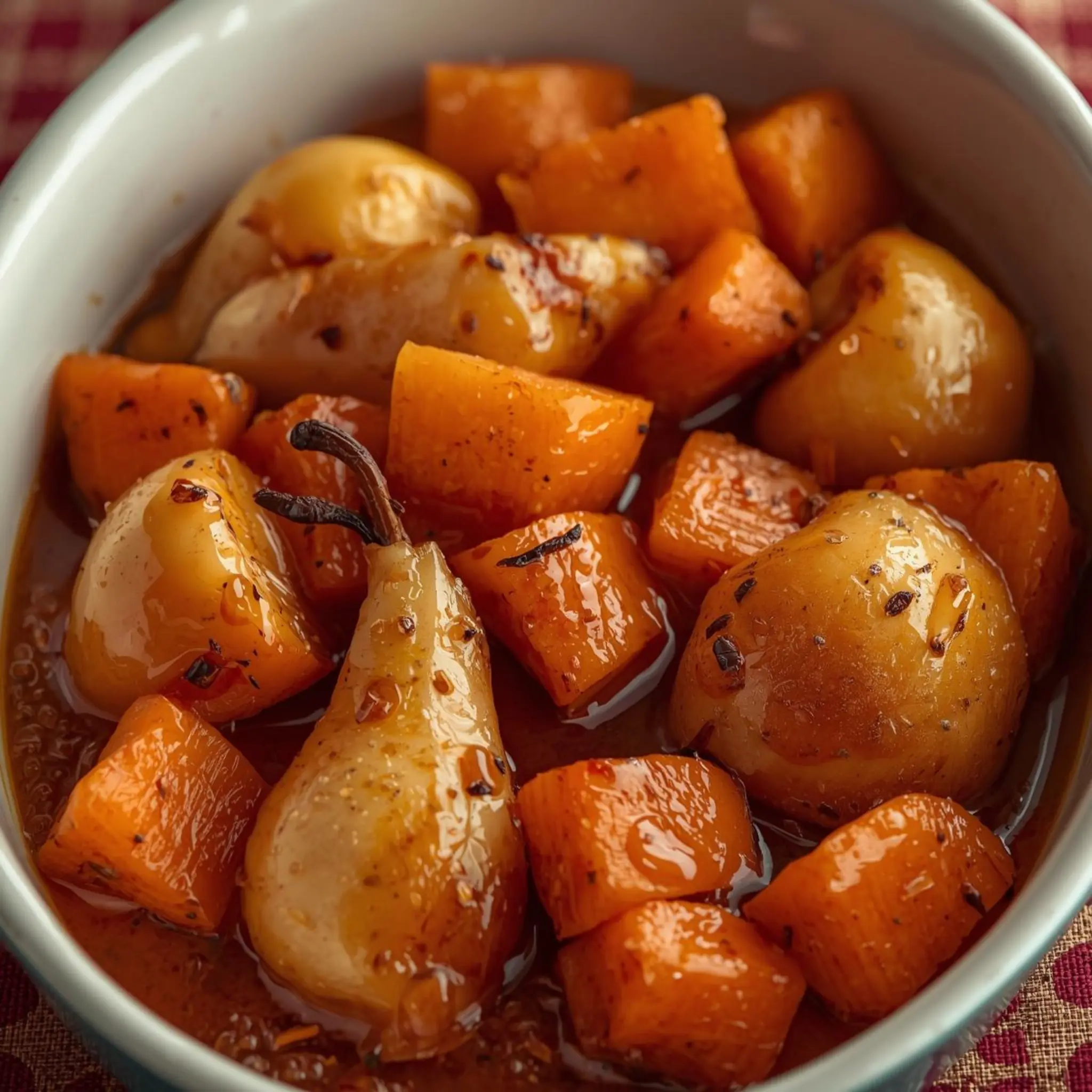 Geröstete Birnen und Süßkartoffeln mit Ahornsirup