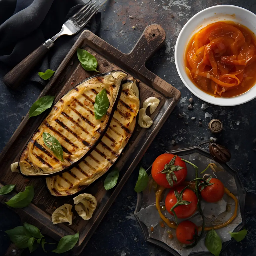 Millefeuilles d'aubergines grillées et tomates anciennes au basilic et coulis de tomates
