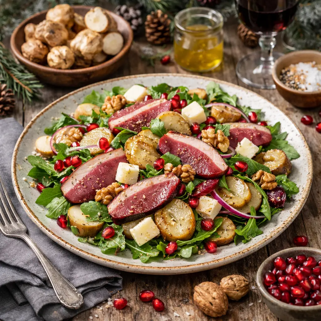 Quand les topinambours — ces racines un peu bosselées qu’on oublie dans le fond du frigo — rencontrent le magret de canard fumé, la magie opère. Cette salade compose une entrée (ou un repas léger) à la fois croquante, fondante et parfumée, idéale pour les repas d’hiver ou les fêtes.